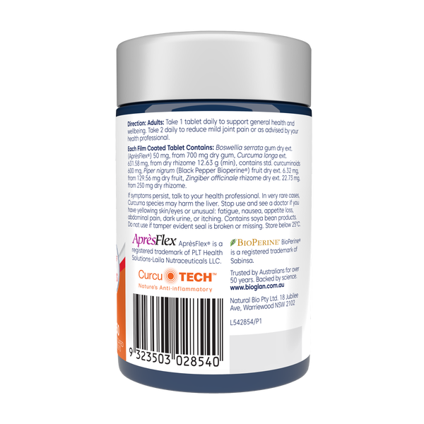 Each tablet provides fewer than 5 kcal of energy, with negligible amounts of protein, fat, carbohydrate, sugar, fibre, and salt. The active nutrients include approximately 500 mg of curcumin extract, 100 mg of boswellia serrata extract, and 50 mg of ginger root extract, along with 5 mg of black pepper extract to aid absorption. This synergistic blend is designed to deliver targeted antioxidant and anti-inflammatory support, offering effective pain relief and mobility support without unnecessary calories or fillers.