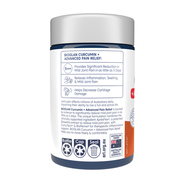 Bioglan Curcumin + Advanced Pain Relief 50 Tablets is a high-strength supplement formulated to support joint comfort, mobility, and overall wellbeing. Curcumin, the active compound in turmeric, is renowned for its antioxidant and anti-inflammatory properties, helping to ease stiffness and protect cells against oxidative stress. This advanced formula is enhanced with complementary herbal extracts such as boswellia and ginger, traditionally used to relieve pain and support musculoskeletal health. Black pepper extract is added to improve curcumin absorption, ensuring maximum effectiveness. Designed for those experiencing joint discomfort, active individuals, or anyone seeking natural support, these tablets provide convenient daily relief and long-term mobility benefits.