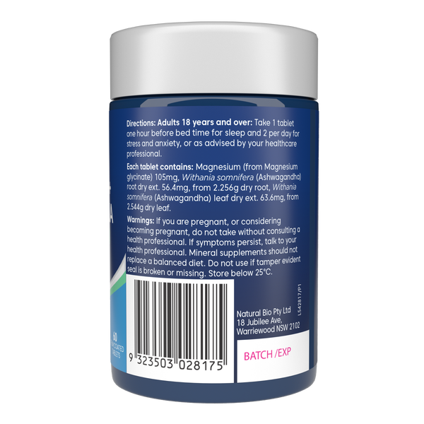 Each capsule contains a blend of magnesium oxide, magnesium citrate, and withania somnifera (ashwagandha root extract), along with microcrystalline cellulose as a bulking agent, silica as an anti-caking agent, and magnesium stearate as a stabiliser. The capsule shell is made from gelatin, glycerin, and purified water.
