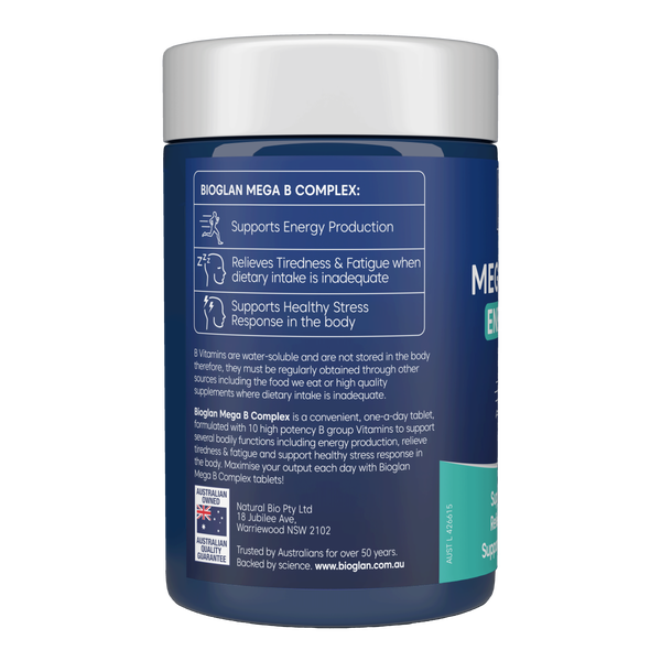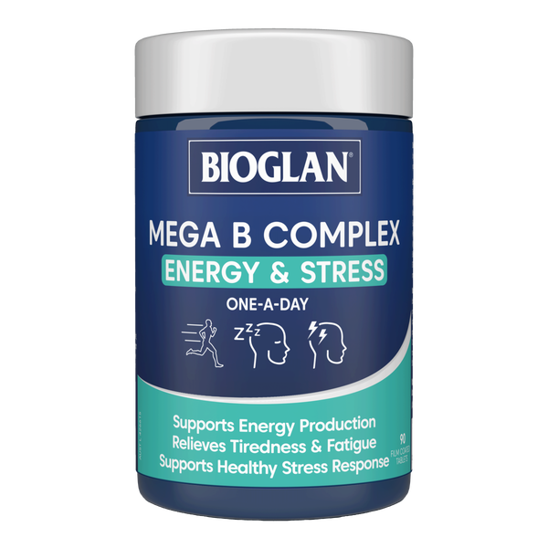 Bioglan Mega B Complex Energy & Stress 90s is a high-strength vitamin supplement formulated to help maintain energy levels and support the body during times of stress. Packed with a full spectrum of essential B vitamins, it contributes to normal energy metabolism, reduces feelings of tiredness and fatigue, and supports healthy psychological function. The B vitamin family also plays a vital role in maintaining the nervous system, promoting mental clarity, and helping the body process nutrients efficiently. With one convenient daily dose, Bioglan Mega B Complex offers comprehensive support for busy, demanding lifestyles where energy and resilience matter most.