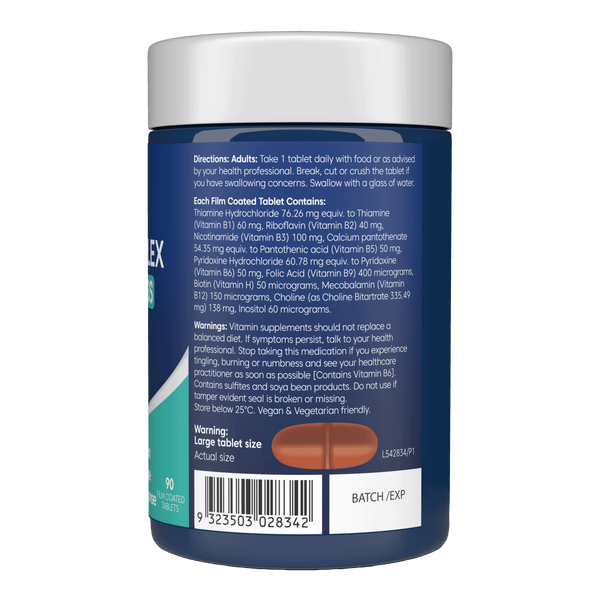 Each daily tablet provides less than 5 kcal of energy with negligible amounts of protein, fat, carbohydrates, sugars, and fiber. It delivers approximately 50 mg of Vitamin B1, 50 mg of Vitamin B2, 100 mg of Niacin (B3), 50 mg of Pantothenic Acid (B5), 50 mg of Vitamin B6, 400 mcg of Folic Acid (B9), 150 mcg of Biotin (B7), and 100 mcg of Vitamin B12. These high-strength doses are designed to provide comprehensive daily support for energy release, nervous system health, and stress resilience, without adding unnecessary calories or fillers.