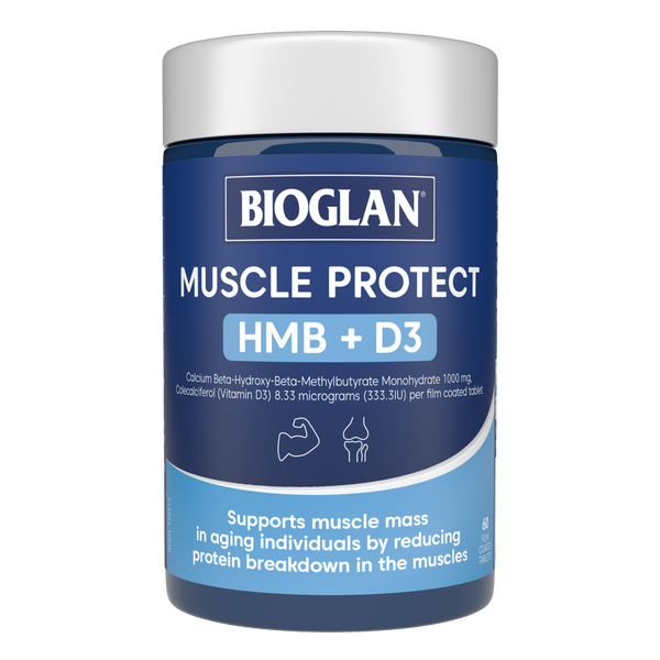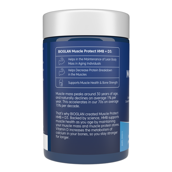 Bioglan Muscle Protect HMB + D3 60 Tablets is a scientifically formulated supplement designed to support muscle strength, recovery, and long-term vitality. HMB (beta-hydroxy beta-methylbutyrate), a metabolite of the amino acid leucine, plays a key role in reducing muscle breakdown while promoting repair and growth. Vitamin D3 complements this action by supporting normal muscle function, bone health, and immune system activity. Together, these nutrients make an effective combination for athletes, active individuals, and older adults looking to preserve muscle mass and performance. Convenient one-a-day tablets provide targeted support for keeping your body strong, active, and resilient.