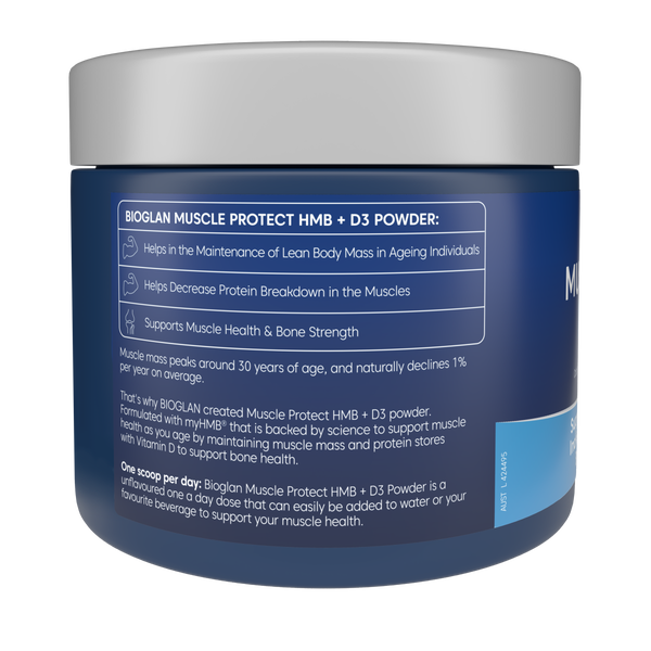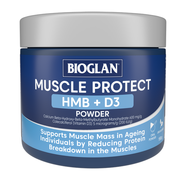 Bioglan Muscle Protect HMB + D3 Powder 150g is a specialised supplement designed to support muscle health, strength, and recovery. Formulated with HMB (beta-hydroxy beta-methylbutyrate), a metabolite of the amino acid leucine, it helps reduce muscle breakdown while promoting muscle repair and growth. Added Vitamin D3 supports bone strength, immune function, and muscle performance, making this blend an ideal partner for active individuals, athletes, or anyone looking to maintain muscle mass as they age. The powder mixes easily into water, juice, or shakes, offering a convenient way to fortify your daily routine and help keep your body strong and resilient.