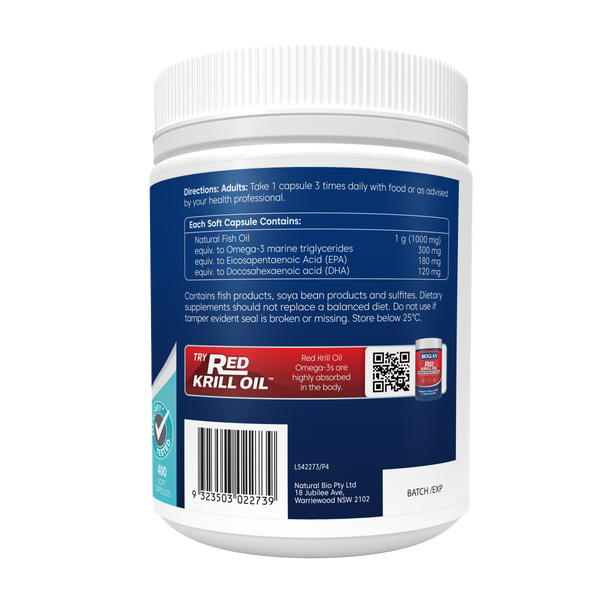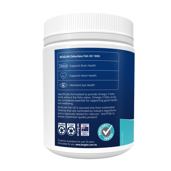 Bioglan Odourless Fish Oil 1000mg 400s is a high-quality omega-3 supplement formulated to support heart, brain, eye, and joint health. Each capsule delivers a natural source of the essential fatty acids EPA and DHA, which play an important role in cardiovascular function, cognitive performance, vision, and mobility. Specially refined to remove fishy odour and aftertaste, these capsules are a pleasant way to maintain your daily omega-3 intake. With 400 capsules per pack, it provides long-lasting value and convenience, making it an excellent choice for anyone seeking reliable, everyday support for overall health and vitality.