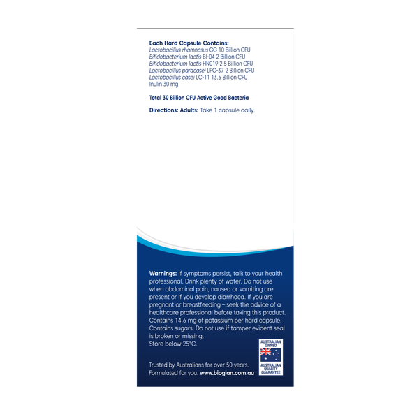 Each capsule provides fewer than 2 kcal of energy, with negligible protein, fat, carbohydrate, sugar, fibre, and salt. The active nutrient profile delivers approximately 30 billion CFU of live probiotics from multiple Lactobacillus and Bifidobacterium strains, alongside small amounts of prebiotic inulin to enhance effectiveness. This low-calorie formulation is designed to provide targeted daily support for digestive health, immune protection, and gut microbiome balance without unnecessary fillers or additives.