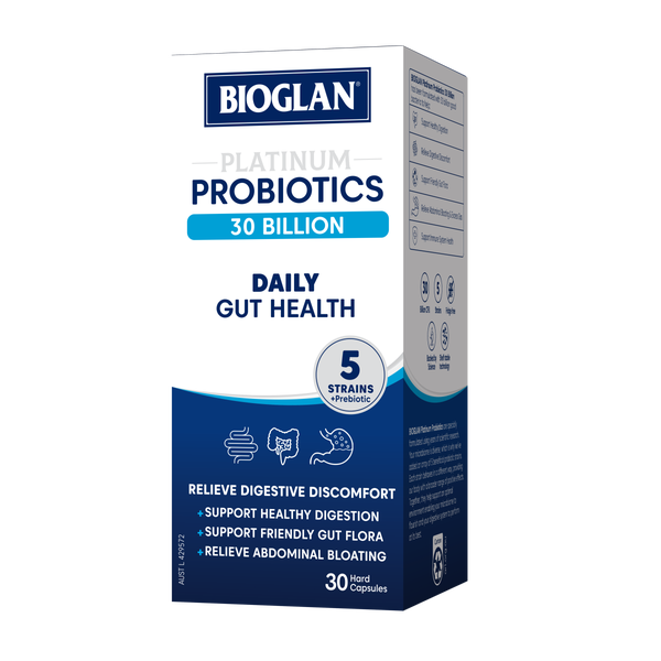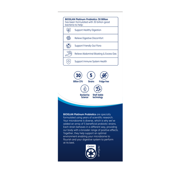 Bioglan Platinum Probiotics 30 Billion 30s is a high-strength probiotic supplement formulated to support digestive balance, immune health, and overall vitality. Containing 30 billion live cultures from scientifically researched strains, this premium blend helps restore and maintain a healthy gut microbiome, which is essential for efficient digestion, nutrient absorption, and natural immune defence. Perfect for those recovering from illness, experiencing digestive discomfort, or simply looking to optimise gut health, these once-daily capsules are designed for maximum effectiveness. With a convenient 30-day supply, Bioglan Platinum Probiotics 30 Billion is a simple, effective way to maintain inner balance and everyday wellbeing.