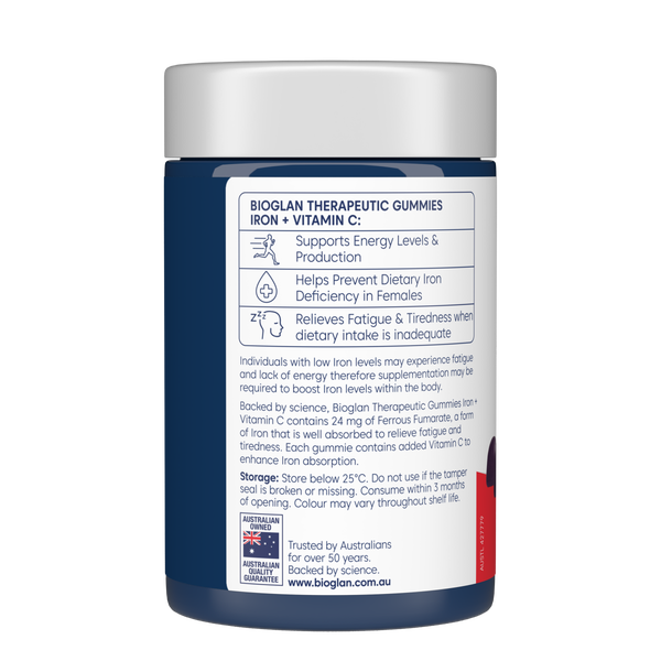 Bioglan Therapeutic Gummies Iron + Vit C 90s are a tasty and convenient way to support daily energy, immune health, and overall wellbeing. Iron is an essential mineral that contributes to normal red blood cell formation and oxygen transport in the body, helping reduce tiredness and fatigue. Vitamin C enhances iron absorption while also supporting the immune system and protecting cells from oxidative stress. These fruity gummies are perfect for those who find traditional tablets hard to swallow, combining effective nutrition with a delicious flavor. Designed for busy lifestyles, they make maintaining healthy iron levels simple and enjoyable.