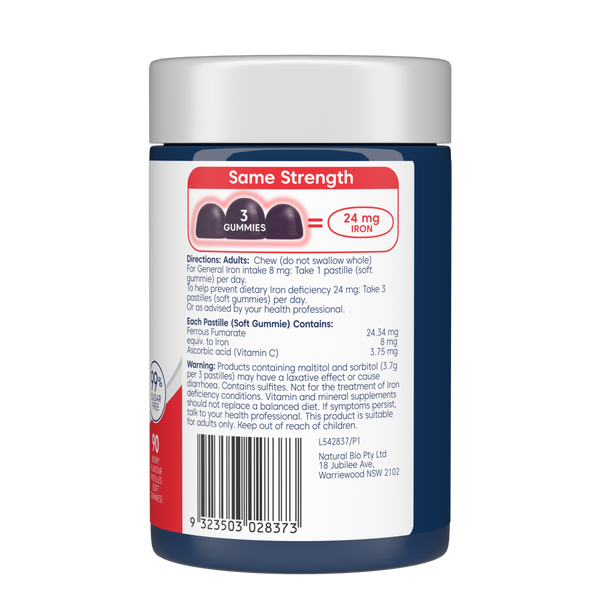 Each gummy is made with glucose syrup, sugar, and purified water as a base, combined with ferrous fumarate as a source of iron and ascorbic acid to provide Vitamin C. Pectin is used as a gelling agent, with citric acid to regulate acidity, and natural fruit flavors for a pleasant taste. Fruit and vegetable concentrates provide natural coloring, while coconut oil and carnauba wax are added as glazing agents to give the gummies their smooth texture.