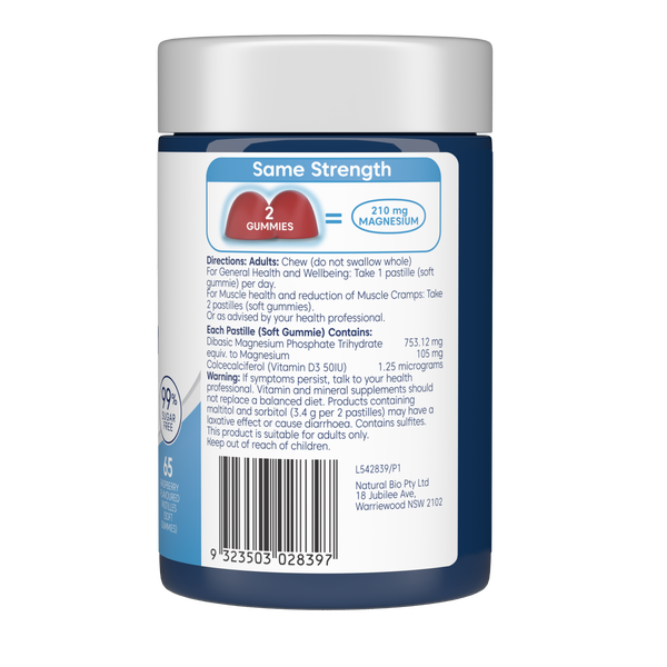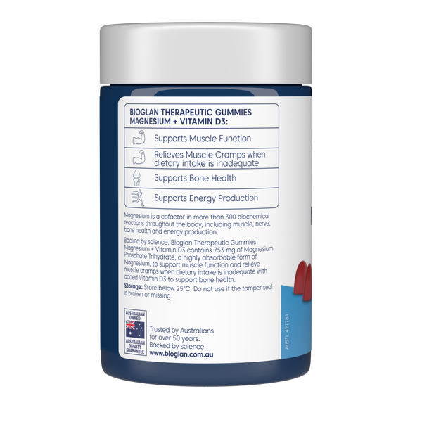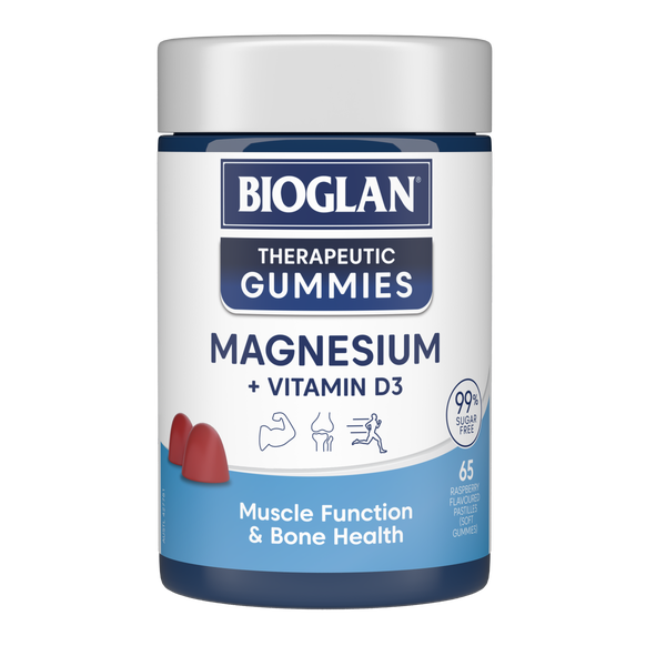 Bioglan Therapeutic Gummies Magnesium + Vitamin D3 65s are a tasty and convenient way to support muscle health, bone strength, and daily vitality. Magnesium is an essential mineral that contributes to normal muscle function, energy metabolism, and reduction of tiredness and fatigue. Vitamin D3, the “sunshine vitamin,” aids calcium absorption and helps maintain strong bones and teeth, while also supporting a healthy immune system. Together in a delicious gummy format, this duo offers a simple daily boost for active lifestyles, busy routines, or anyone looking for extra support in maintaining overall wellbeing—without the need for tablets or capsules.