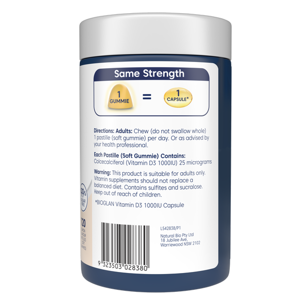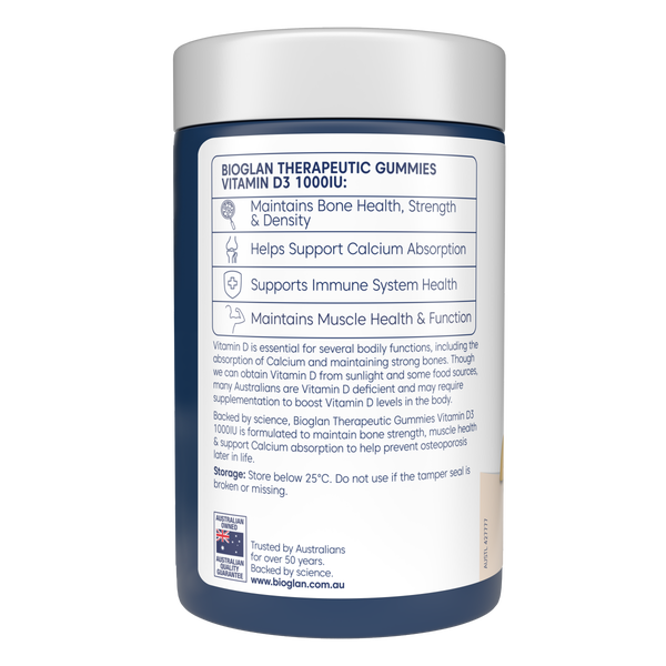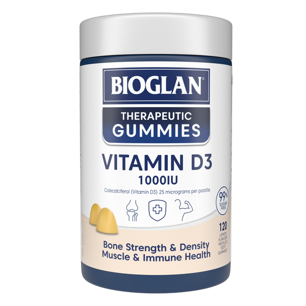 Bioglan Therapeutic Gummies Vitamin D3 1000IU are a delicious and convenient way to support strong bones, healthy muscles, and a well-functioning immune system. Known as the “sunshine vitamin,” Vitamin D3 helps the body absorb calcium more effectively, making it essential for bone strength and density. It also plays a key role in maintaining muscle function and supporting natural immune defences. These fruity gummies are perfect for those who prefer a tasty alternative to tablets or capsules, offering a simple daily dose of high-quality Vitamin D3 in a format the whole family can enjoy.