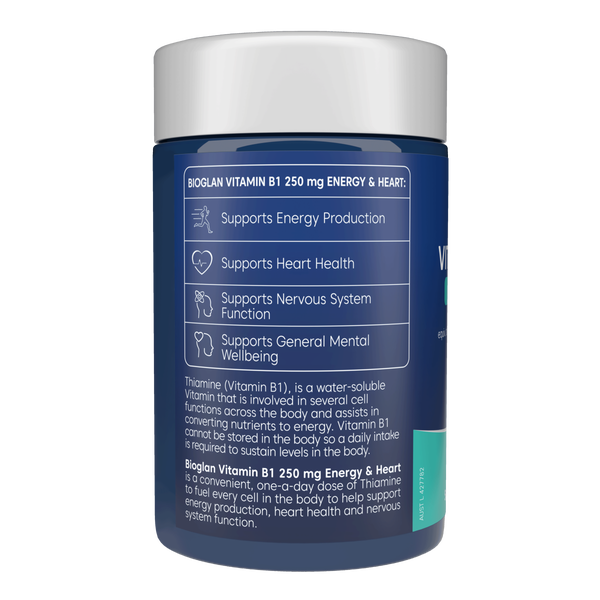 Bioglan Vitamin B1 250 mg Energy & Heart 75s is a high-strength supplement formulated to support energy metabolism, nervous system health, and cardiovascular function. Also known as thiamine, Vitamin B1 plays a vital role in converting food into energy and maintaining the normal function of the heart and nerves. This convenient one-a-day tablet provides a potent dose, making it ideal for those with demanding lifestyles, low dietary intake, or anyone needing extra support for vitality and wellbeing. With 75 tablets per pack, Bioglan Vitamin B1 offers over two months of daily energy and heart health support in an easy-to-swallow format.