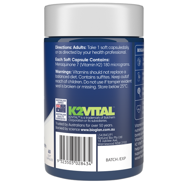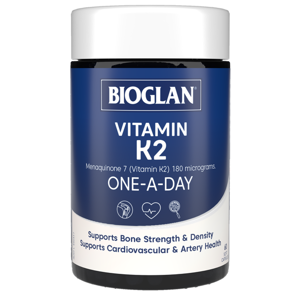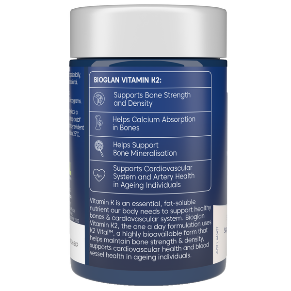 Bioglan Vitamin K2 is a premium supplement formulated to support bone and cardiovascular health. Vitamin K2 plays a vital role in directing calcium to the bones and teeth, where it is needed most, while helping to prevent calcium deposits from forming in the arteries and blood vessels. This ensures strong skeletal support alongside cardiovascular protection. With a bioavailable form of Vitamin K2, this supplement is designed for optimal absorption and effectiveness. Suitable for daily use, Bioglan Vitamin K2 is an ideal choice for anyone looking to maintain long-term bone density, dental strength, and circulatory wellbeing in one convenient capsule.