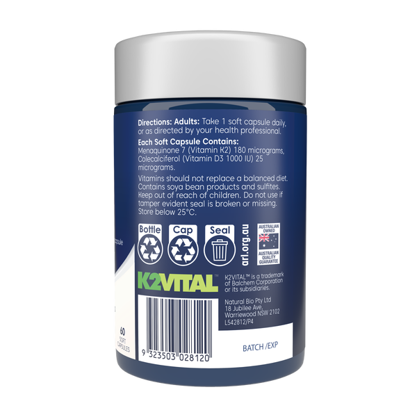 Bioglan Vitamin K2 + D3 60 Capsules is a premium bone and heart health supplement that combines two essential nutrients for maximum synergy. Vitamin D3, the “sunshine vitamin,” supports calcium absorption and contributes to strong bones, teeth, and immune function. Vitamin K2 helps direct calcium to where it’s needed most—bones and teeth—while preventing deposits from forming in arteries and blood vessels, supporting cardiovascular health. This powerful combination provides a dual-action approach to maintaining skeletal strength and circulatory wellbeing. Convenient daily capsules make it simple to add Bioglan Vitamin K2 + D3 to your routine, ensuring long-term support for healthy bones, muscles, and heart.