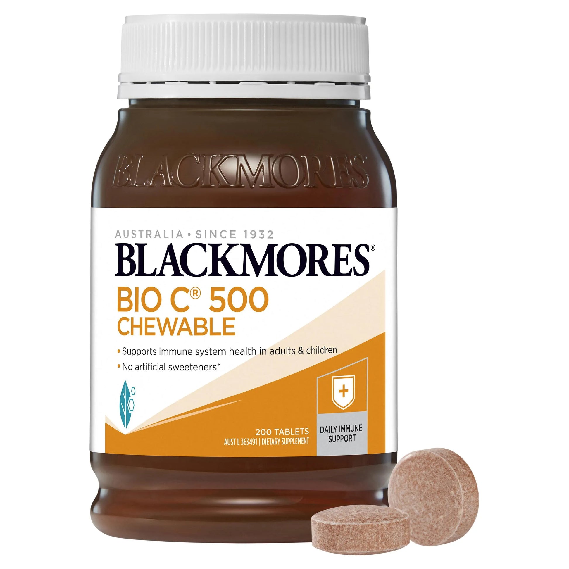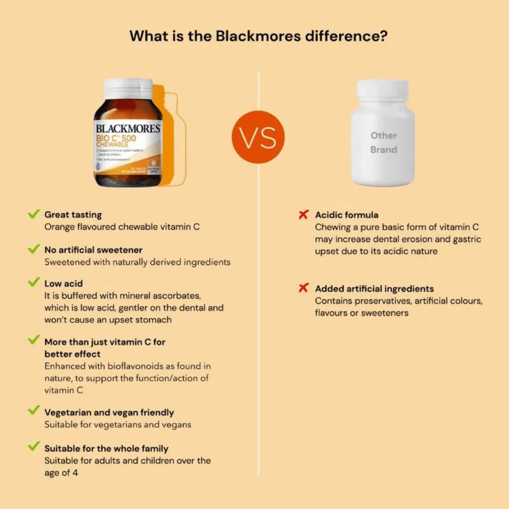 Blackmores Bio C® 500 Chewable is a great tasting orange-flavoured chewable that gives you a boost of vitamin C and supports immune system health in adults and children from 4 years of age.