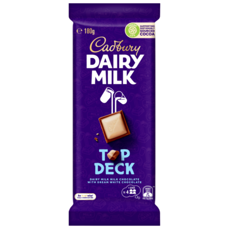 Our family sharing chocolate block of Cadbury Dairy Milk Top Deck is the best of both worlds, Cadbury Dairy Milk milk chocolate and Dream white chocolate. A smooth & creamy combination that is sure to please any crowd. Cadbury Dairy Milk chocolate blocks are proudly made in Tasmania. Cadbury Dairy Milk milk chocolate and Dream white chocolate are made with the equivalent of a glass and a half of full cream milk in every 200g. Supporting sustainably sourced cocoa. Cadbury believes that tasting good and doing good should go hand in hand. The cocoa life program aims to improve the livelihoods of farming communities and the landscapes where cocoa grows.