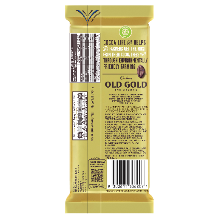 45% Cocoa. Generous chunks of rich Old Gold dark chocolate with ginger biscuit pieces and toffee flavoured pieces. WITH GINGER BISCUIT PIECES ANDTOFFEE FLAVOURED PIECES