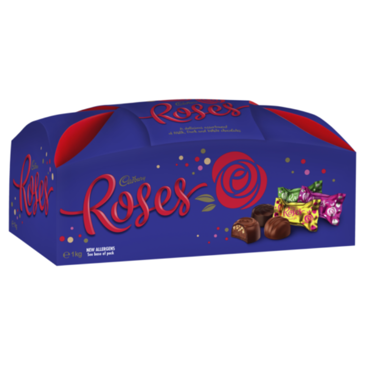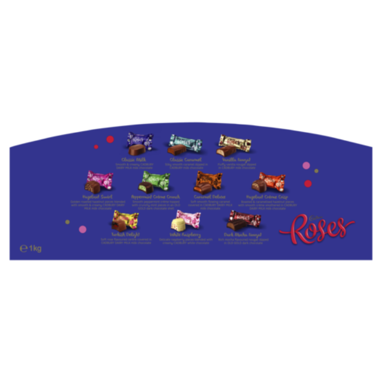 Cadbury Roses feature a delicious variety of popular flavours covered in our famous Cadbury chocolate. An assortment of Classic Milk, Strawberry Crème, Peppermint Crème, Orange Crème, Caramel Deluxe, Hazelnut Swirl, Passionfruit Delight, Vanilla Nougat, Turkish Delight and Classic Caramel flavours.