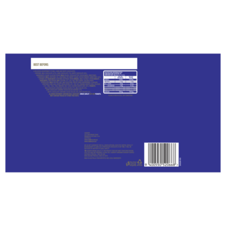 Sugar, Full Cream Milk, Cocoa Mass, Glucose Syrup, Cocoa Butter, Milk Solids, Invert Sugar, Sweetened Condensed Milk, Vegetable Fat, Hazelnut Pieces, Humectant (422), Golden Syrup, Emulsifiers (Soy Lecithin, 471, 476), Rice Crisps, Barley Malt Extract, Salt, Acidity Regulators (330, 331, 450), Hydrolysed Milk Protein, Orange Juice Concentrate, Maltodextrin, Gelling Agents (440, 341), Flavours, Cocoa Powder, Strawberries, Apples, Raising Agent (500), Orange Puree, Colours (163, 160c, 160a).Classic Caramel: May Contain Wheat, Gluten, Peanuts, Tree Nuts.Caramel Deluxe: May Contain Wheat, Gluten, Peanuts, Tree Nuts.Vanilla Nougat: May Contain Wheat, Peanuts, Tree Nuts.Classic Milk: May Contain Wheat, Gluten, Peanuts, Tree Nuts.Turkish Delight: May Contain Wheat, Gluten, Peanuts, Tree Nuts.Hazelnut Swirl: May Contain Wheat, Gluten, Peanuts, Other Tree Nuts.Strawberry Creme: May Contain Wheat, Gluten, Peanuts, Tree Nuts.Peppermint Creme: May Contain Wheat, Gluten, Peanuts, Tree Nuts.Passionfruit Delight: May Contain Wheat, Gluten, Peanuts, Tree Nuts.Orange Creme: May Contain Wheat, Gluten, Peanuts, Tree Nuts.