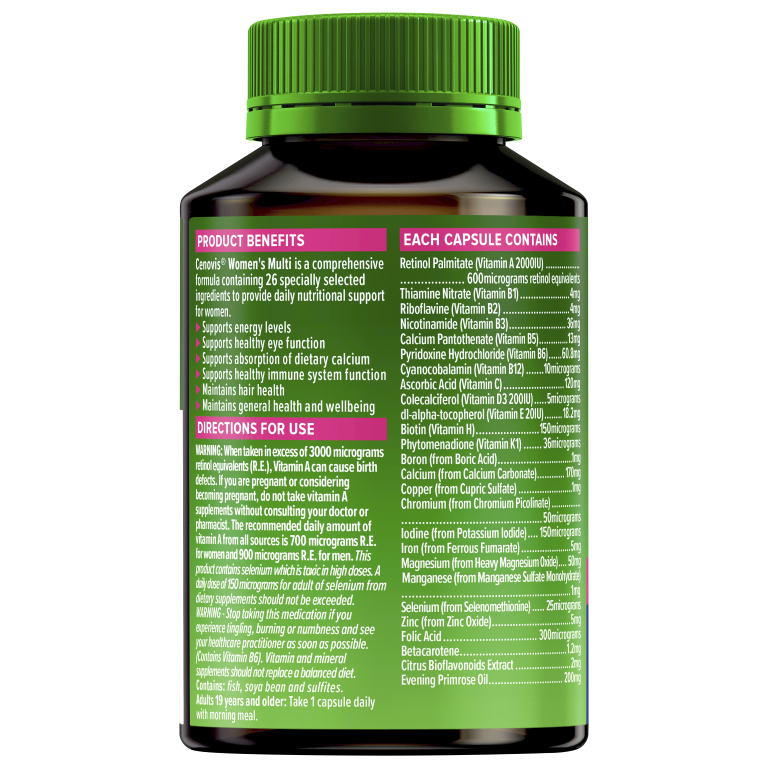 • Cenovis® Women’s Multi combines specially selected ingredients to support your energy, immunity, hair health, and dietary calcium absorption—all in one daily capsule.