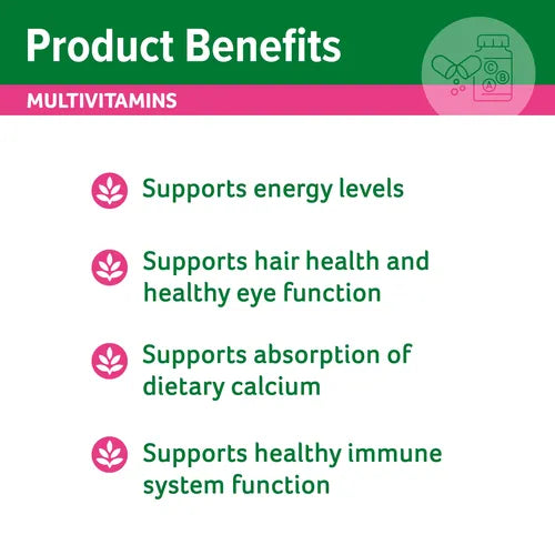 • Our comprehensive women’s multivitamin formula provides the nutritional backup you need for general wellbeing without the complicated regimen. One multivitamin capsule, once a day—because you’ve got better things to do than organise a supplement schedule.
