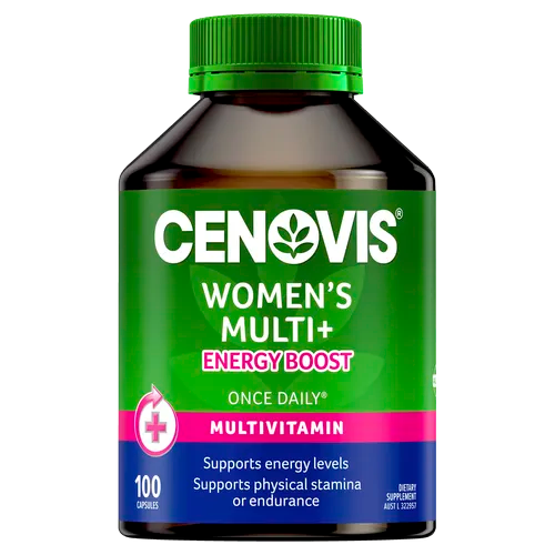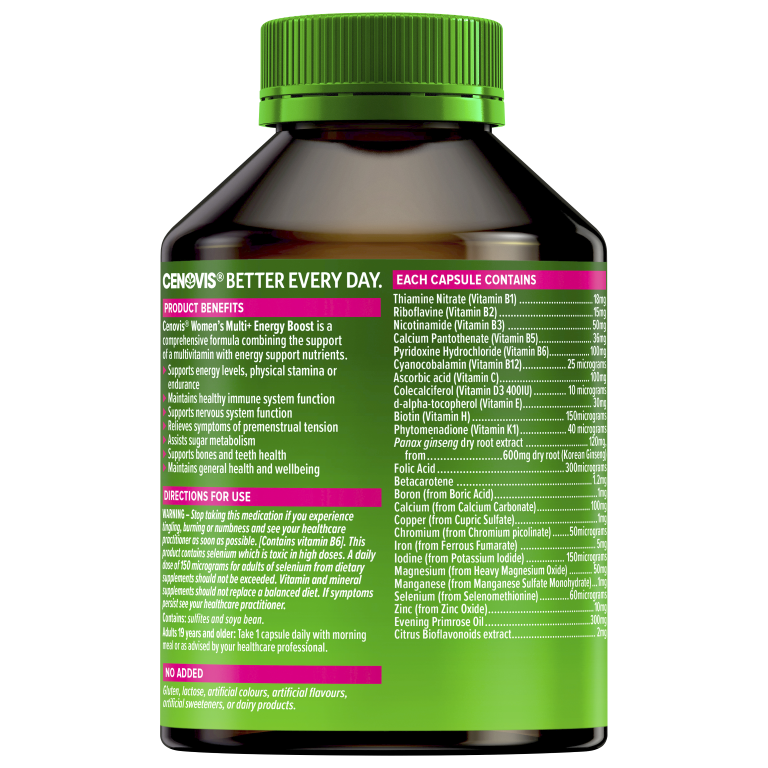 • Cenovis® Women’s Multi + Energy Boost combines over 25 nutrients, including B Vitamins, Iron, Korean Ginseng and Evening Primrose Oil. It supports energy levels, physical stamina and endurance — because that to-do list just won’t quit.