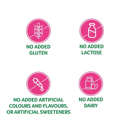 No added gluten, lactose, artificial colours, artificial flavours, artificial sweeteners, or dairy products.