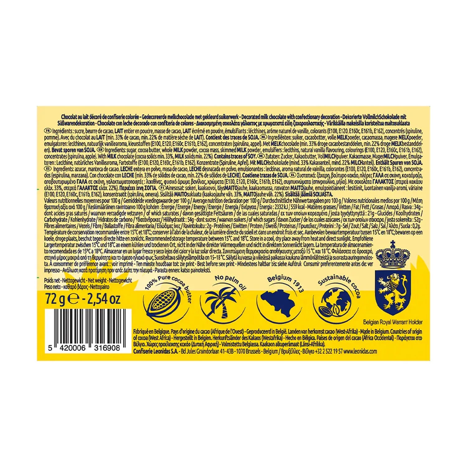 Milk chocolate pencils made with 100% cocoa butter and coated in a thin layer of coloured white chocolate. Sold in a pre-packed box of 8 pencils (72g).
