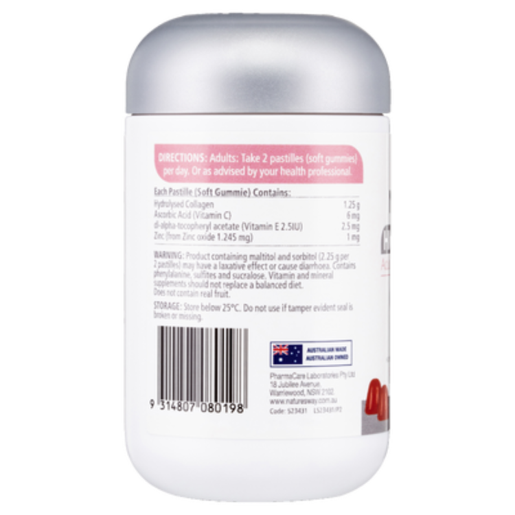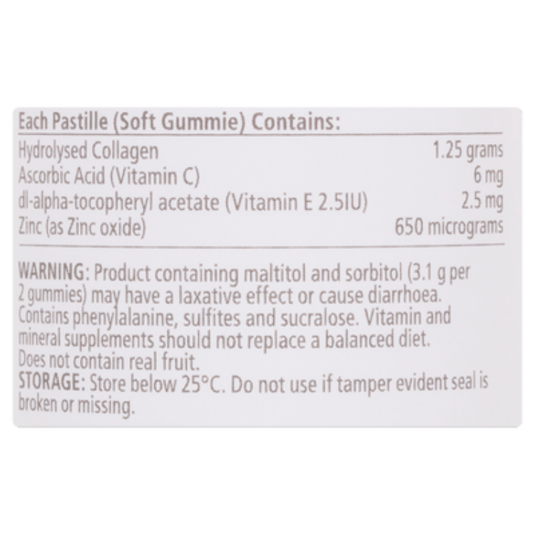 Hydrolyzed Collagen, Vitamin C, Hyaluronic Acid, Zinc, Biotin, Microcrystalline Cellulose, Magnesium Stearate.