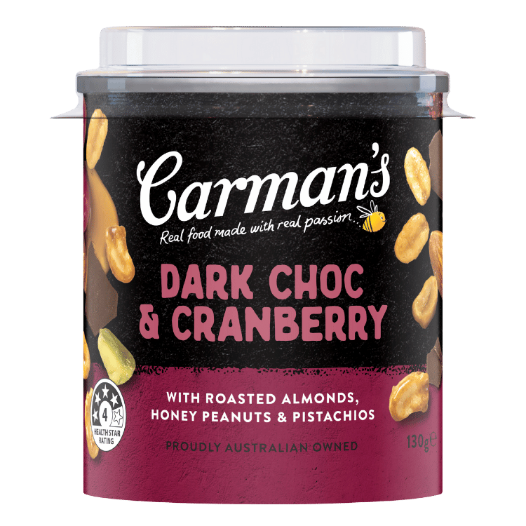 Carman’s Dark Choc & Cranberry Gourmet Snack Mix is moreish medley made with with roasted almonds, honey peanuts & pistachios.