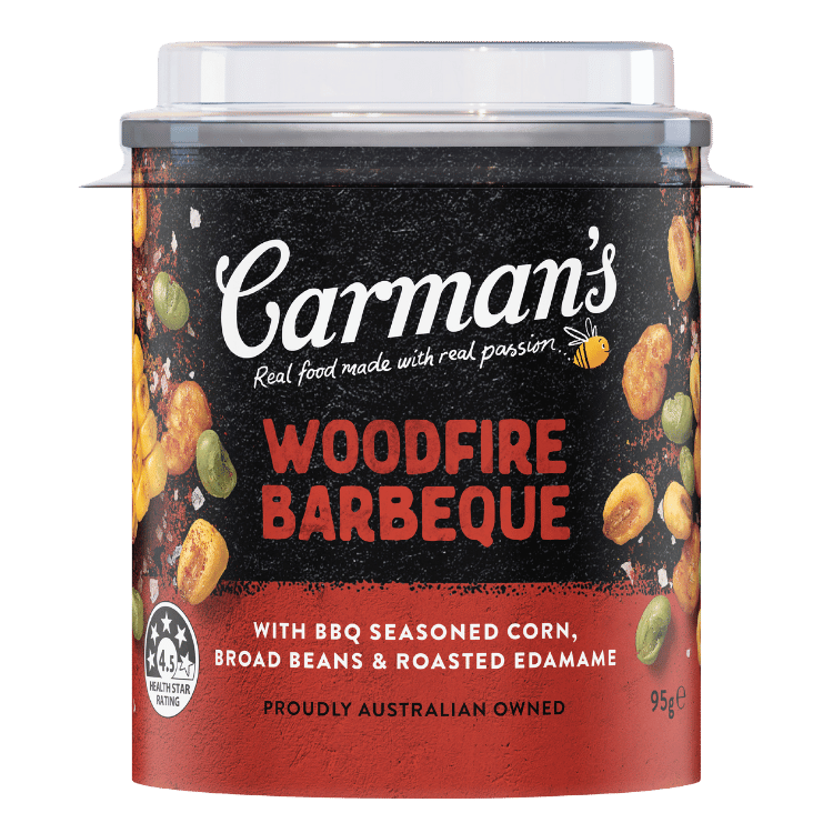 Carman’s Woodfire BBQ Gourmet Snack Mix is a moreish medley made with BBQ seasoned corn, broad beans & roasted sesame.