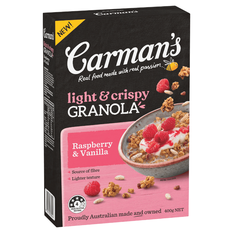 this light & crispy textured granola is crafted by toasting aussie whole grain oats wit puffs of rice and blended together with raspberry & vanilla – an all-time favourite combination. it’s mouth wateringly good for you, with  a source of fibre – not to mention satisfying and light enough to enjoy everyday!