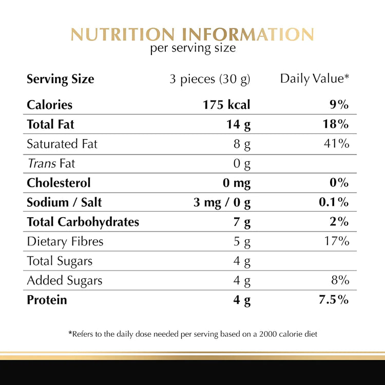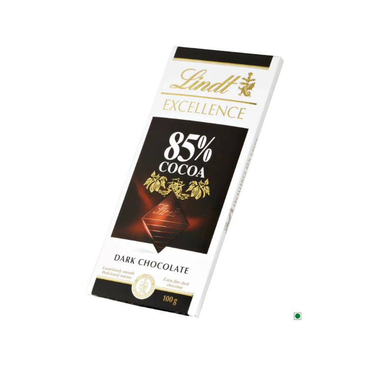 Per 100g, Lindt Excellence 85% Cocoa Dark Chocolate provides about 580–600 kcal of energy, with 46–48 grams of fat, 19–22 grams of carbohydrates (of which sugars are about 11–12 grams), and 11–12 grams of protein. With its high cocoa content, it is naturally rich in antioxidants and offers a balanced bitterness that defines premium dark chocolate.