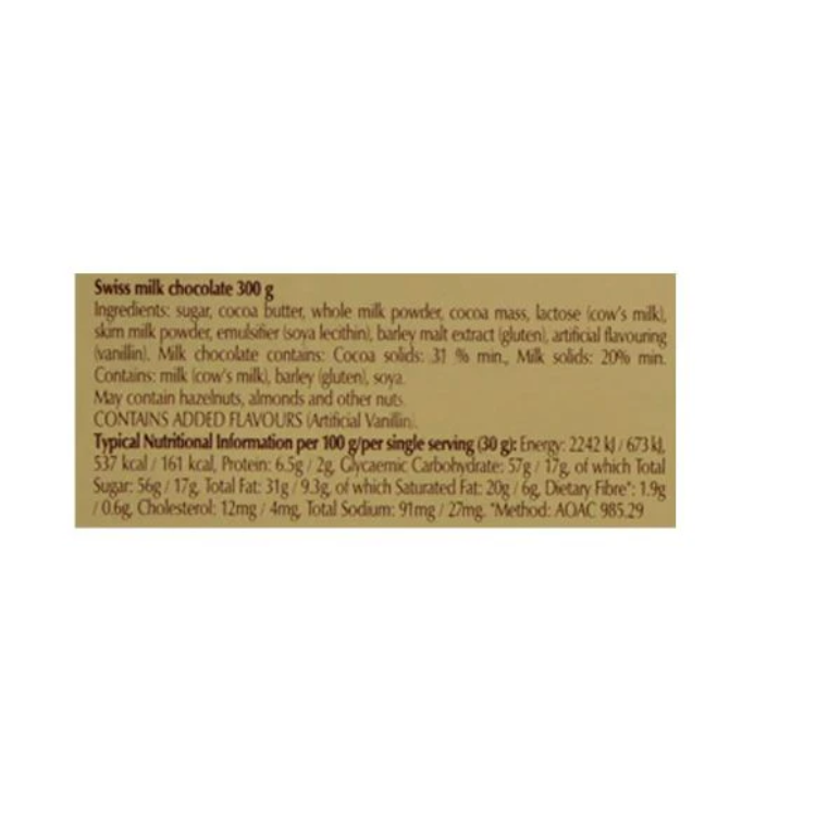 Per 100g, Lindt Gold Tab Milk Chocolate provides approximately 535–550 kcal of energy, with 32–34 grams of fat, 54–56 grams of carbohydrates (of which sugars are about 50–52 grams), and 6–7 grams of protein. This indulgent Swiss milk chocolate is smooth, creamy, and perfectly balanced, making every bite a moment of pure delight.