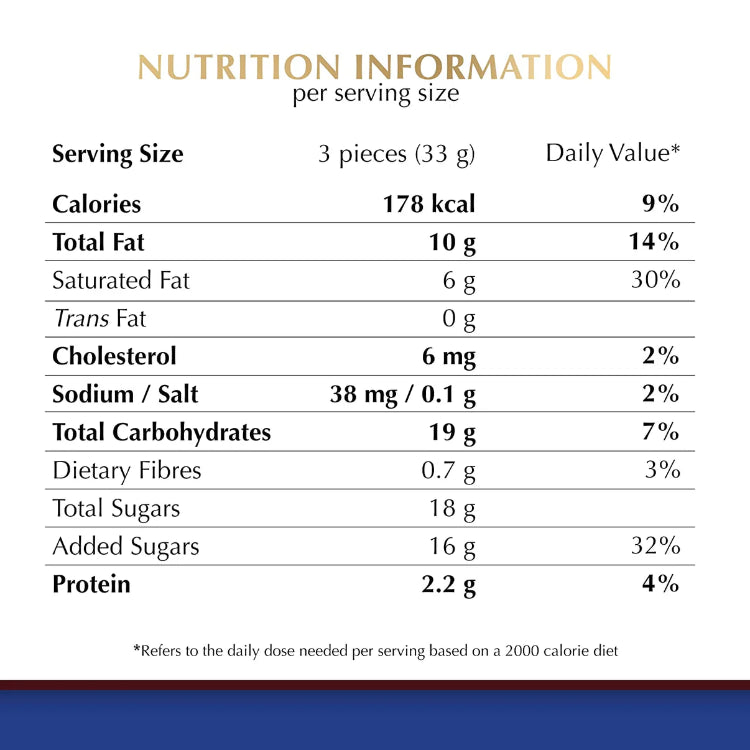 Every 100g bar provides around 535–545 kcal of energy, with 32g of fat (including about 19g saturated fat), 52g of carbohydrates (of which 50g are sugars), and 7g of protein. With its balanced creaminess and rich cocoa notes, each bite offers a comforting and indulgent chocolate experience.