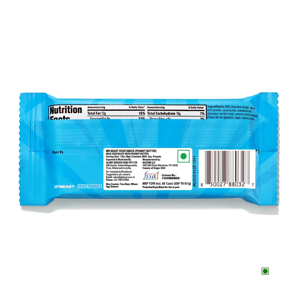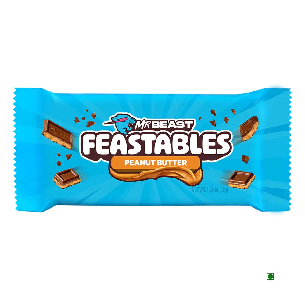 Satisfy your cravings with the MrBeast Feastables Peanut Butter Chocolate Bar (35g) – a smooth and creamy fusion of rich chocolate and roasted peanut butter. Made with just a handful of simple, plant-based ingredients, this bar is gluten-free, naturally delicious, and crafted to deliver a guilt-free snacking experience in a convenient size.