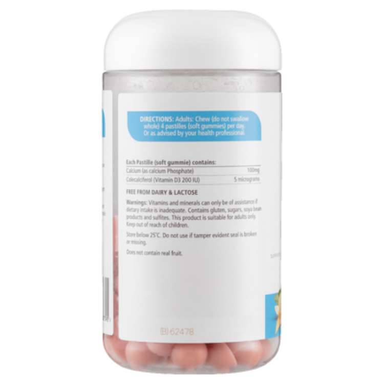 Calcium (as Calcium Phosphate), Vitamin D3 (Cholecalciferol), Glucose Syrup, Sugar, Gelatin, Natural Flavours, Natural Colours, Citric Acid.