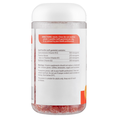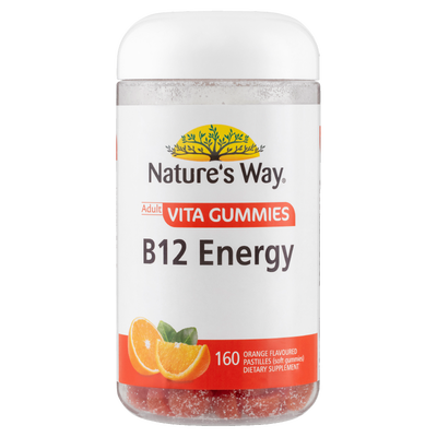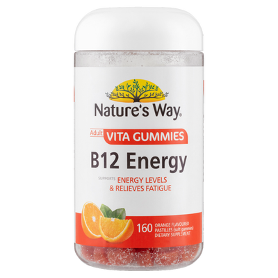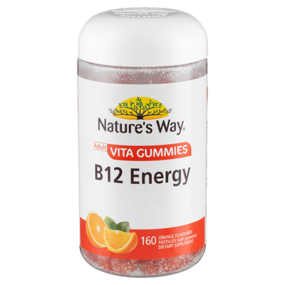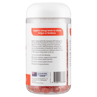 Nature's Way Adult Vita Gummies B12 Energy has been specifically formulated for when you need extra support to maintain energy production in the body. B12 Energy provides 1000 micrograms of B12 per day, plus the added benefits of Vitamins B1 and B2. These orange flavoured gummies are a delicious and easy way to help support energy levels on the go.