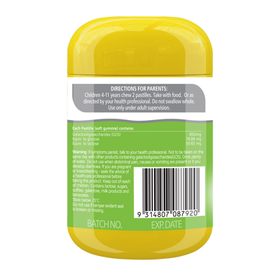 DIRECTIONS FOR PARENTS: Children 4-11 years chew 2 pastilles. Take with food. Or as directed by your health professional. Do not swallow whole. Use only under adult supervision. If symptoms persist, talk to your health professional. Not to be taken on the same day with other products containing galactooligosaccharides(GOS). Drink plenty of water. Do not use when abdominal pain, nausea or vomiting are present or if you develop diarrhoea. If you are pregnant or breastfeeding - seek the advice of a healthcare professional before taking this product. Keep out of reach of children. Contains sugars, lactose and benzoates. Store below 25°C. Do not use if tamper evident seal is broken or missing.