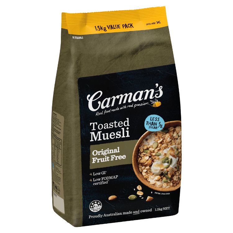 Carman’s Toasted Original Fruit Free Muesli is made using our original crispy baked Australian oats with crunchy almonds, pecans, pepitas and a hint of cinnamon. This muesli is low FODMAP certified, low GI and contains a source of fibre and protein.