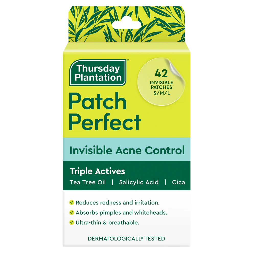 Thursday Plantation Patch Perfect Invisible Acne Control is your triple-action solution for pimples – gentle on skin, tough on acne. Powered by the secret to clearer-looking skin – Tea Tree Oil – and boosted with Salicylic Acid and Cica, each ultra-thin hydrocolloid patch works hard to absorb pimples and whiteheads, reduce redness, and calm irritation. Invisible under makeup or worn overnight, Patch Perfect fits seamlessly into your routine. Breathable, barely-there, and dermatologically tested, it’s your go-to patch for clear, confident skin – anytime, anywhere.