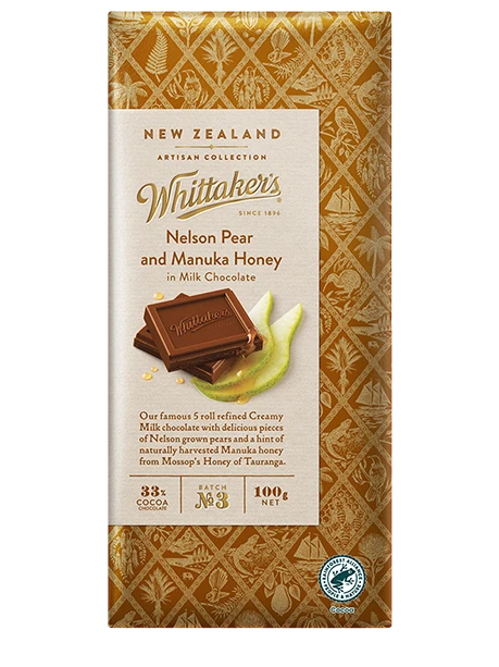 Sugar, Cocoa Butter, Whole Milk Powder, Cocoa Mass, Natural Pear Flavor, Honey, Emulsifier (Soy Lecithin), Natural Vanilla Flavor.