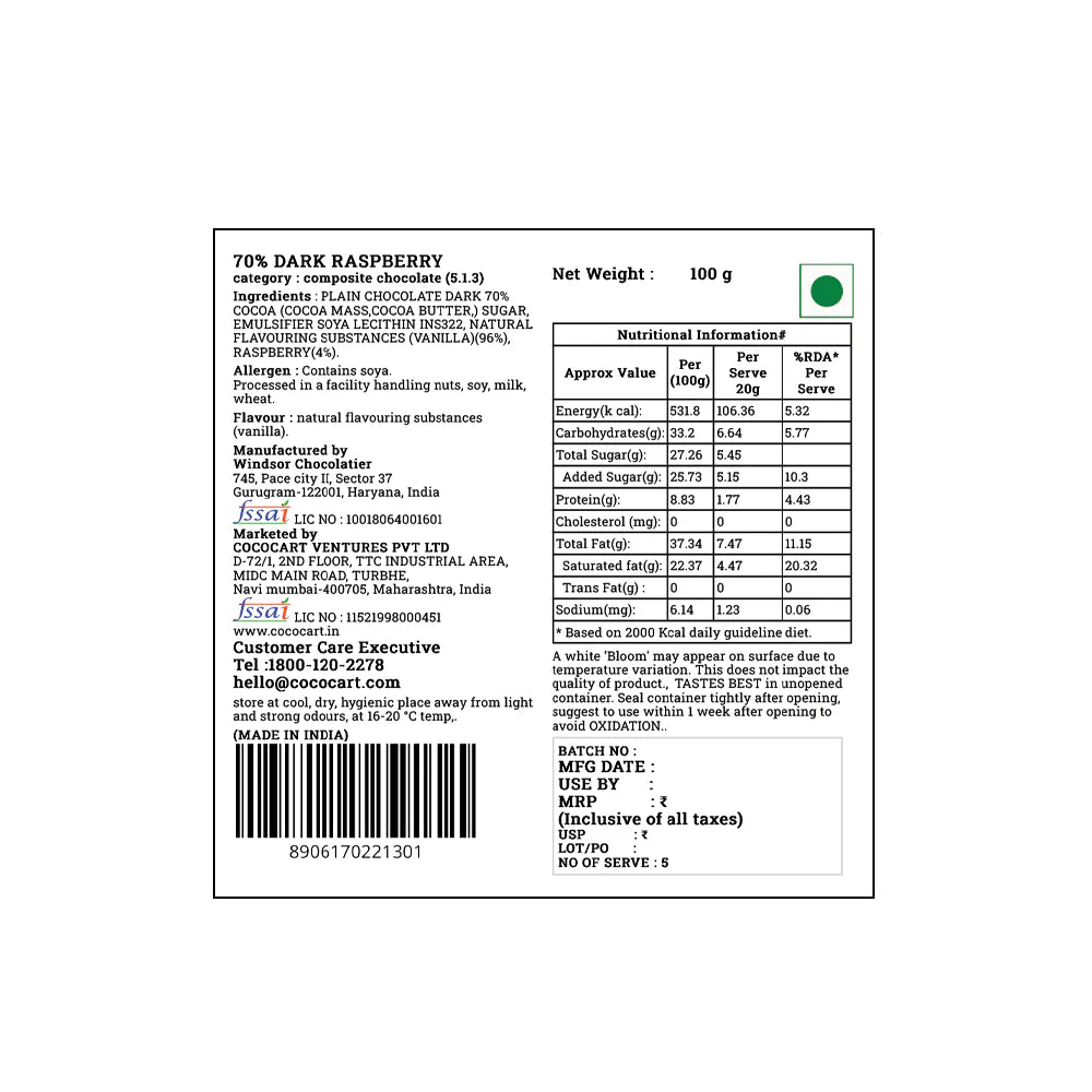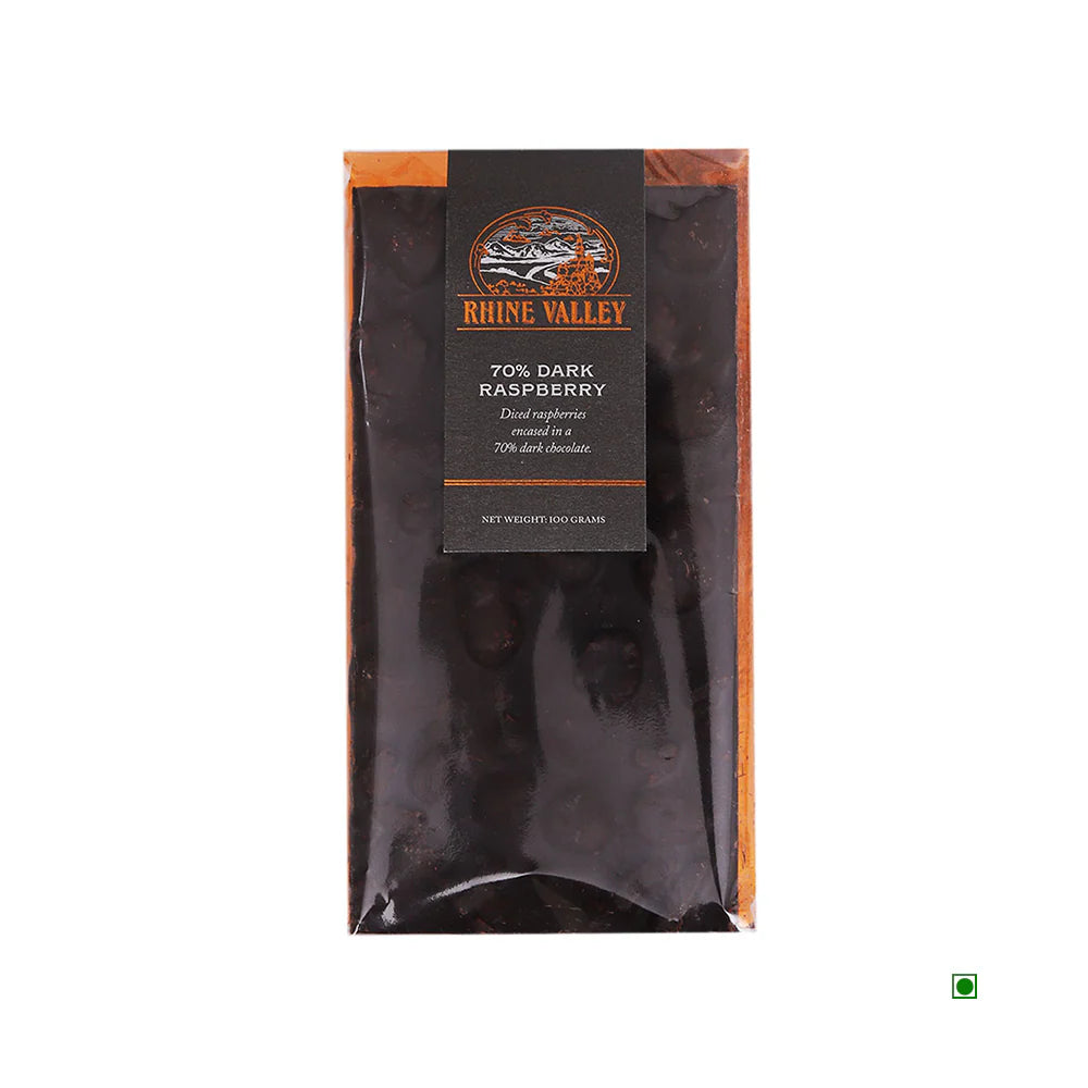 Rich 70% dark chocolate blended with tangy raspberry pieces for a fruity, indulgent treat.