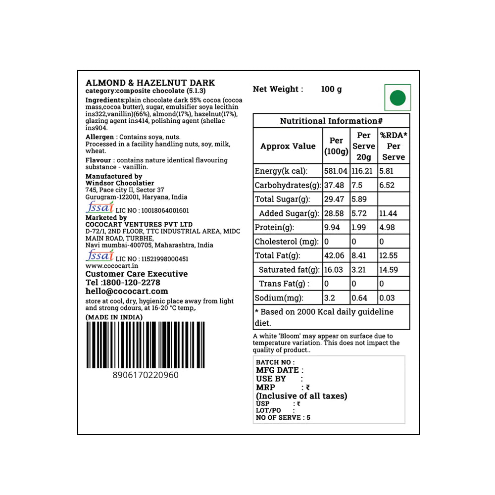 DARK CHOCOLATE 55% COCOA(COCOA SOLIDS(COCOA MASS,COCOA BUTTER),SUGAR, EMULSIFIER SOYA LECITHIN INS322,VANILLIN)(66 %), ALMOND(33.3 %),ROASTED HAZELNUT(33.3 %), GLAZING AGENT INS414, POLISHING AGENT (SHELLAC INS904).