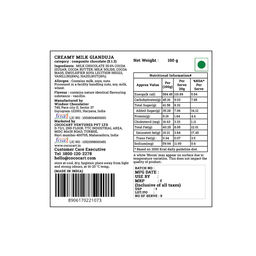 MILK CHOCOLATE 35.6% COCOA (SUGAR, COCOA BUTTER, MILK SOLIDS, COCOA MASS,EMULSIFIER SOYA LECITHIN INS322, VANILLIN)(84%), HAZELNUT(16%).