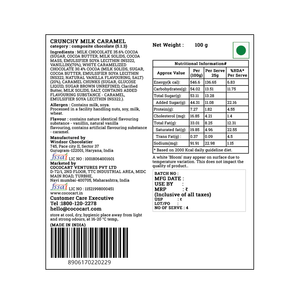 MILK CHOCOLATE(SUGAR, COCOA BUTTER, MILK SOLIDS, COCOA MASS, EMULSIFIER SOYALECITHIN INS322, VANILLIN), CARAMELIZED CHOCOLATE(COCOA BUTTER, SUGAR, MILKSOLIDS, EMULSIFIER SOYA LECITHIN INS322, NATURAL VANILLA FLAVOURING,SALT), CARAMEL CHUNKS (SUGAR, GLUCOSE LIQUID, SUGAR BROWN UNREFINED, ClarifiedButter, MILK SOLIDS, SALT, CONTAINS ADDED FLAVOURING SUBSTANCE - CARAMEL,EMULSIFIER SOYA LECITHIN INS322.).