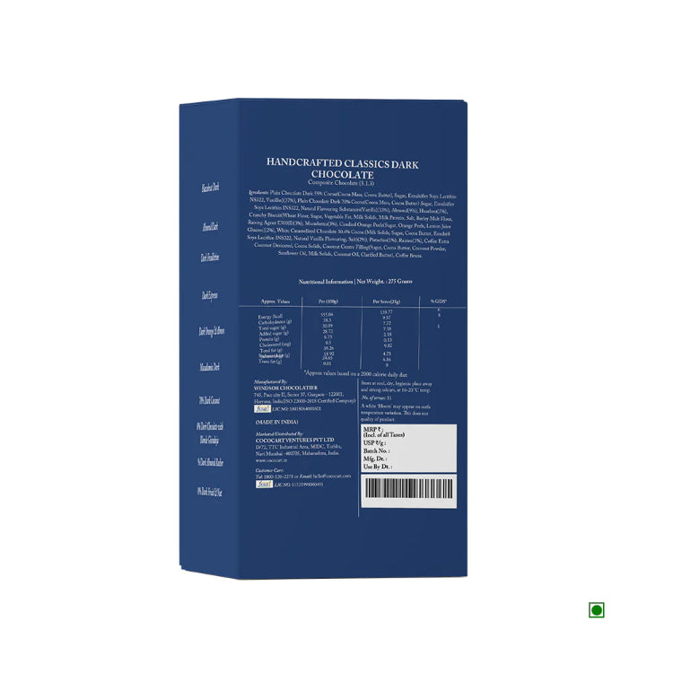 Experience the bold essence of fine chocolate with our Handcrafted Dark Classics in a generous 275g pack. Made by skilled chocolatiers, these dark chocolate pieces deliver an intense cocoa flavor with a smooth, velvety finish that true connoisseurs will appreciate. Perfect for sharing with loved ones, gifting on special occasions, or enjoying as a personal indulgence, this collection embodies the art of classic dark chocolate.