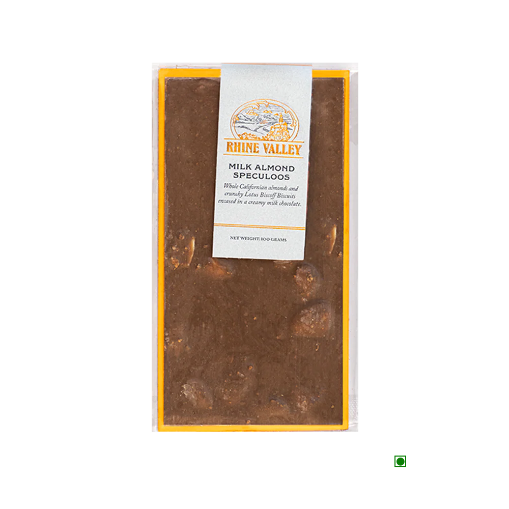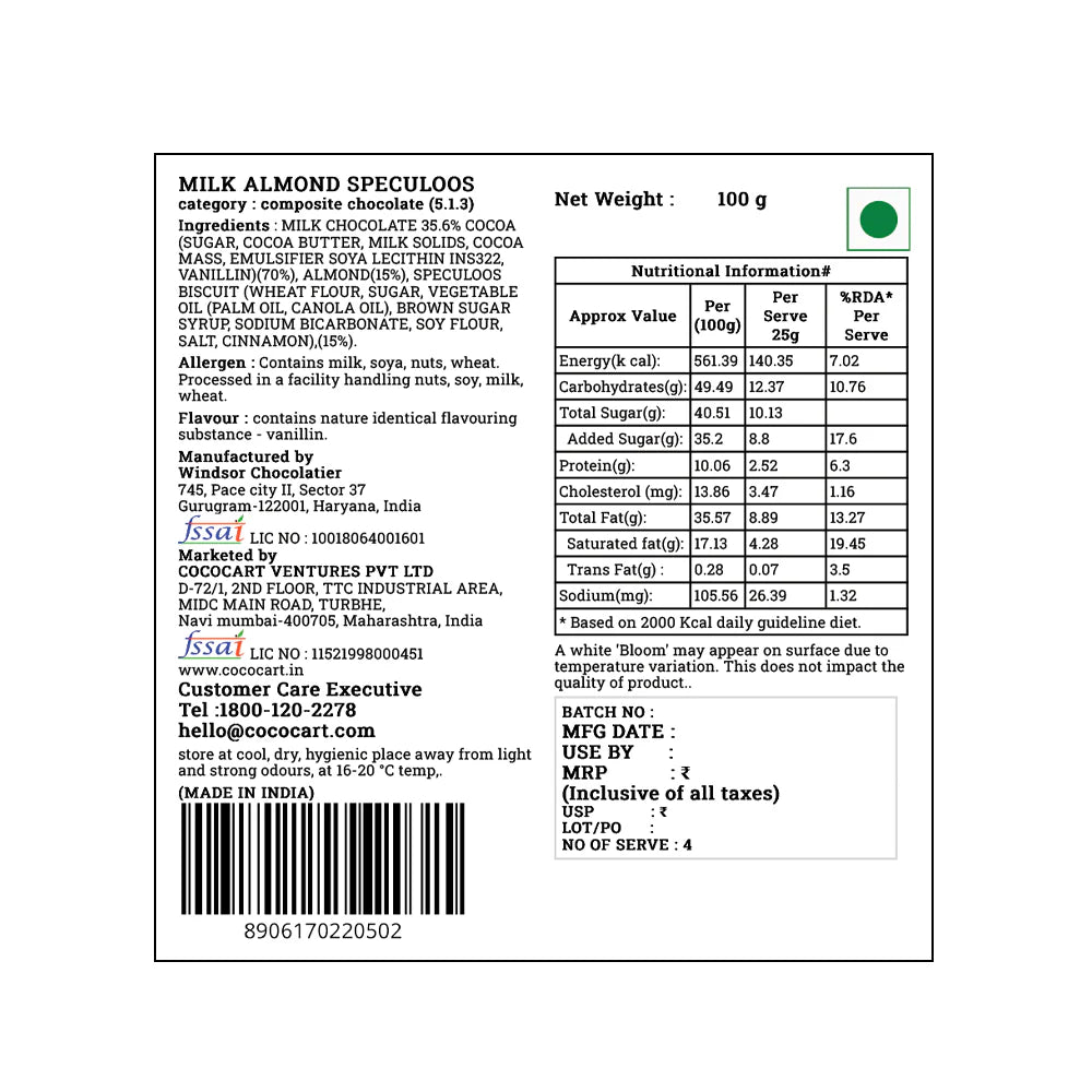 MILK CHOCOLATE 35.6% COCOA(SUGAR, COCOA BUTTER, MILK SOLIDS, COCOA MASS,EMULSIFIER SOYA LECITHIN INS322, VANILLIN)(70%), ALMOND(15%), SPECULOOSBISCUIT (WHEAT FLOUR, SUGAR, VEGETABLE OIL (PALM OIL, CANOLA OIL), BROWNSUGAR SYRUP, SODIUM BICARBONATE, SOY FLOUR, SALT, CINNAMON),(15%).