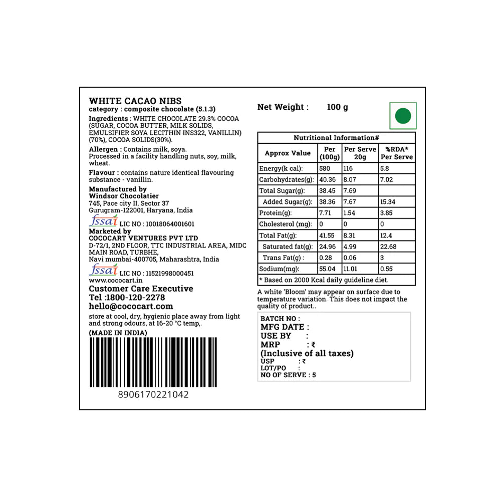 An irrestibly smooth white chocolate generously topped with crunchy cacao nibs.