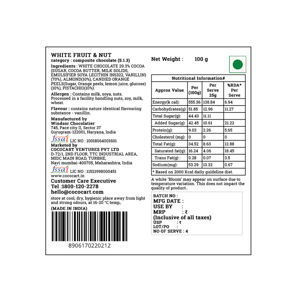 White Chocolate 29.3%, Cocoa(Sugar, Cocoa Butter, Milk Solids, Emulsifier Soya Lecithin INS322, Vanilla), Almond , Candied Orange Peel , Pistachio.