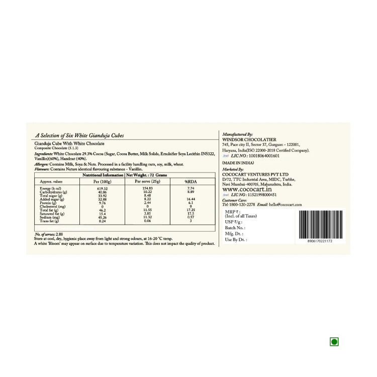 Experience pure indulgence with our White Gianduja Cubes, crafted from silky smooth white chocolate blended with finely ground hazelnuts. Each cube offers a melt-in-your-mouth creaminess with a delicate nutty sweetness that lingers on the palate. Presented in an elegant 6-piece pack, it’s the perfect treat for gifting or enjoying as a personal moment of luxury.